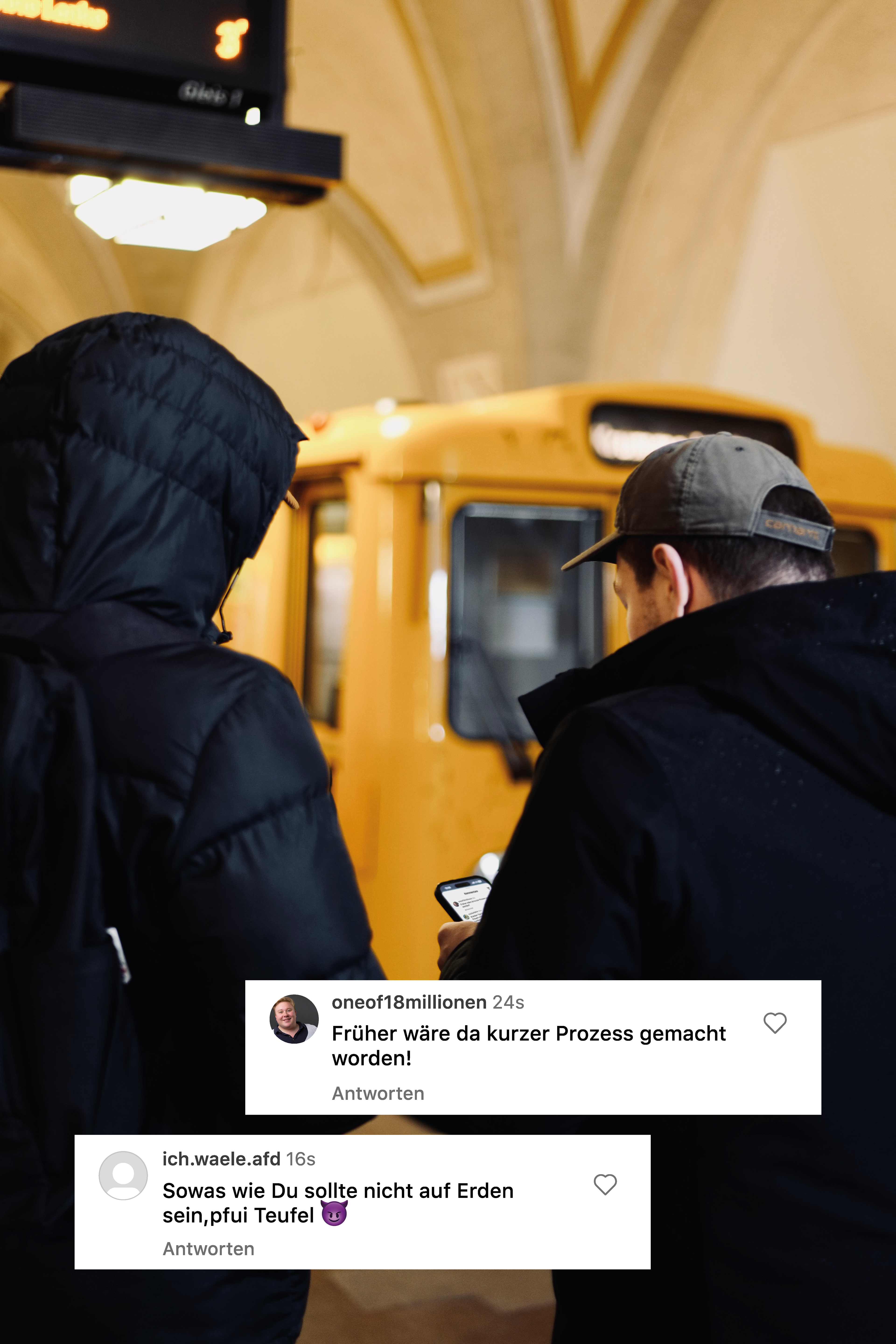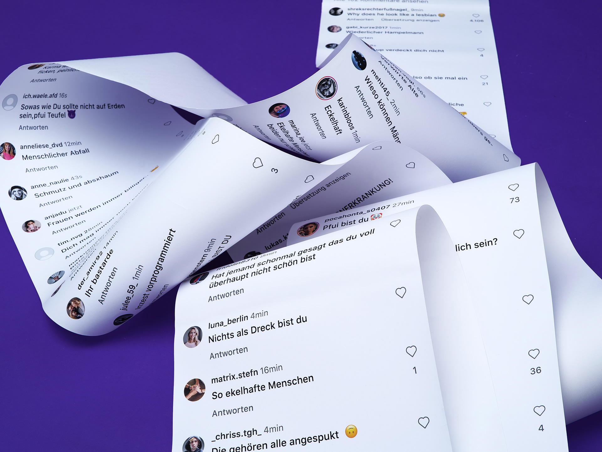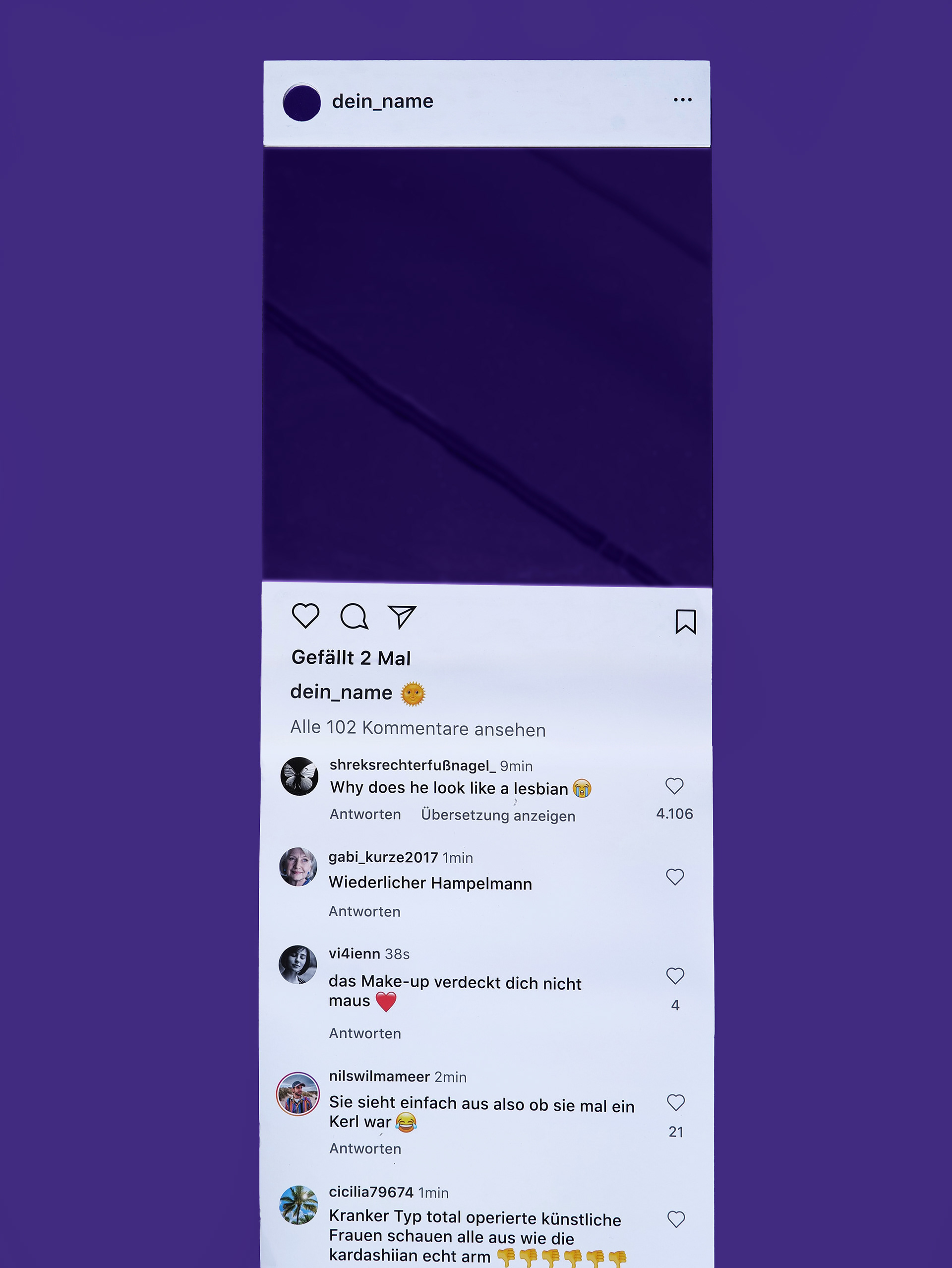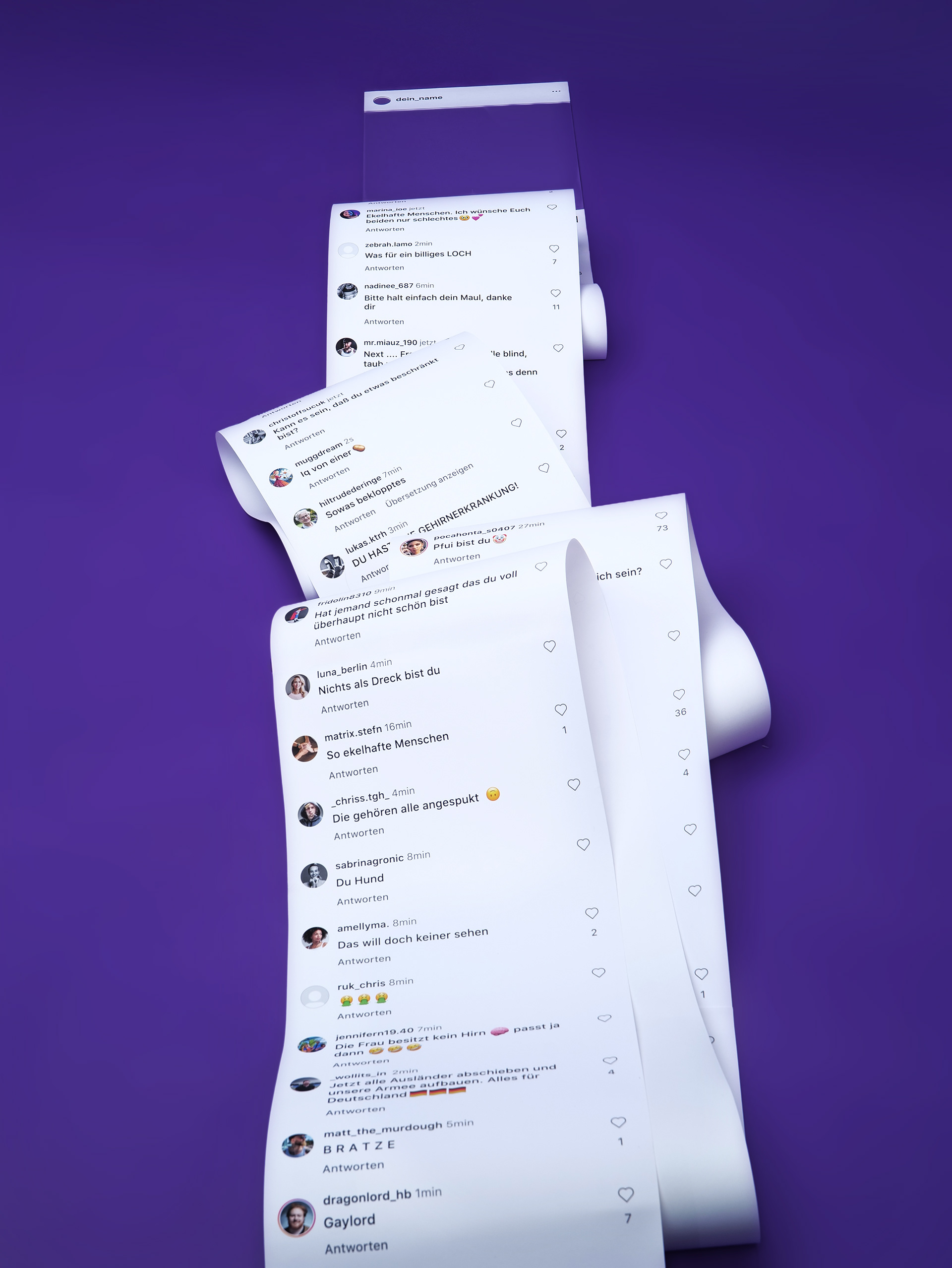 Alle gezeigten Hasskommentare sind mir so im Netz begegnet. Alle Profilbilder und Namen sind verändert, haben jedoch Ähnlichkeiten mit den originalen Hater:innen.