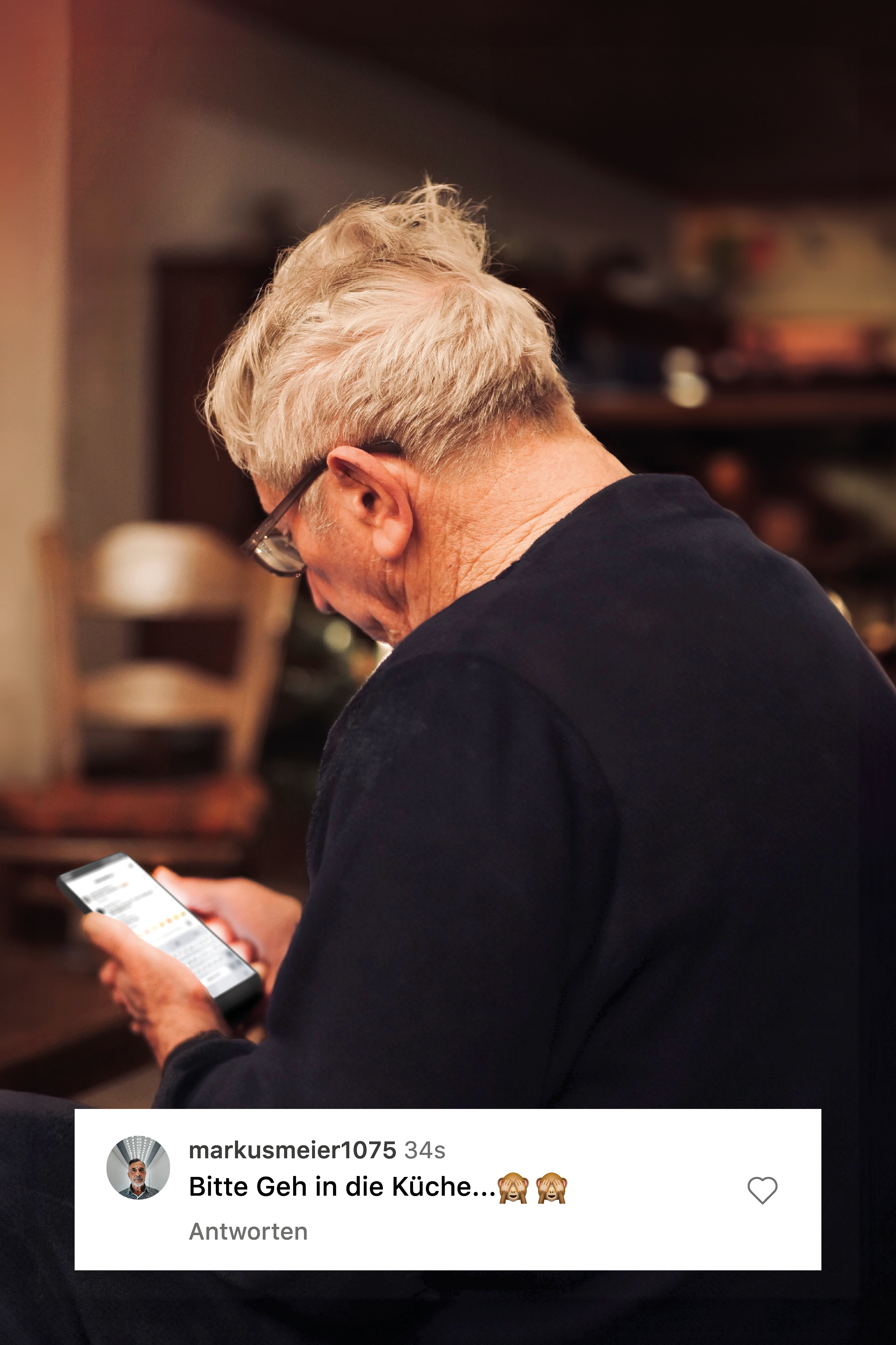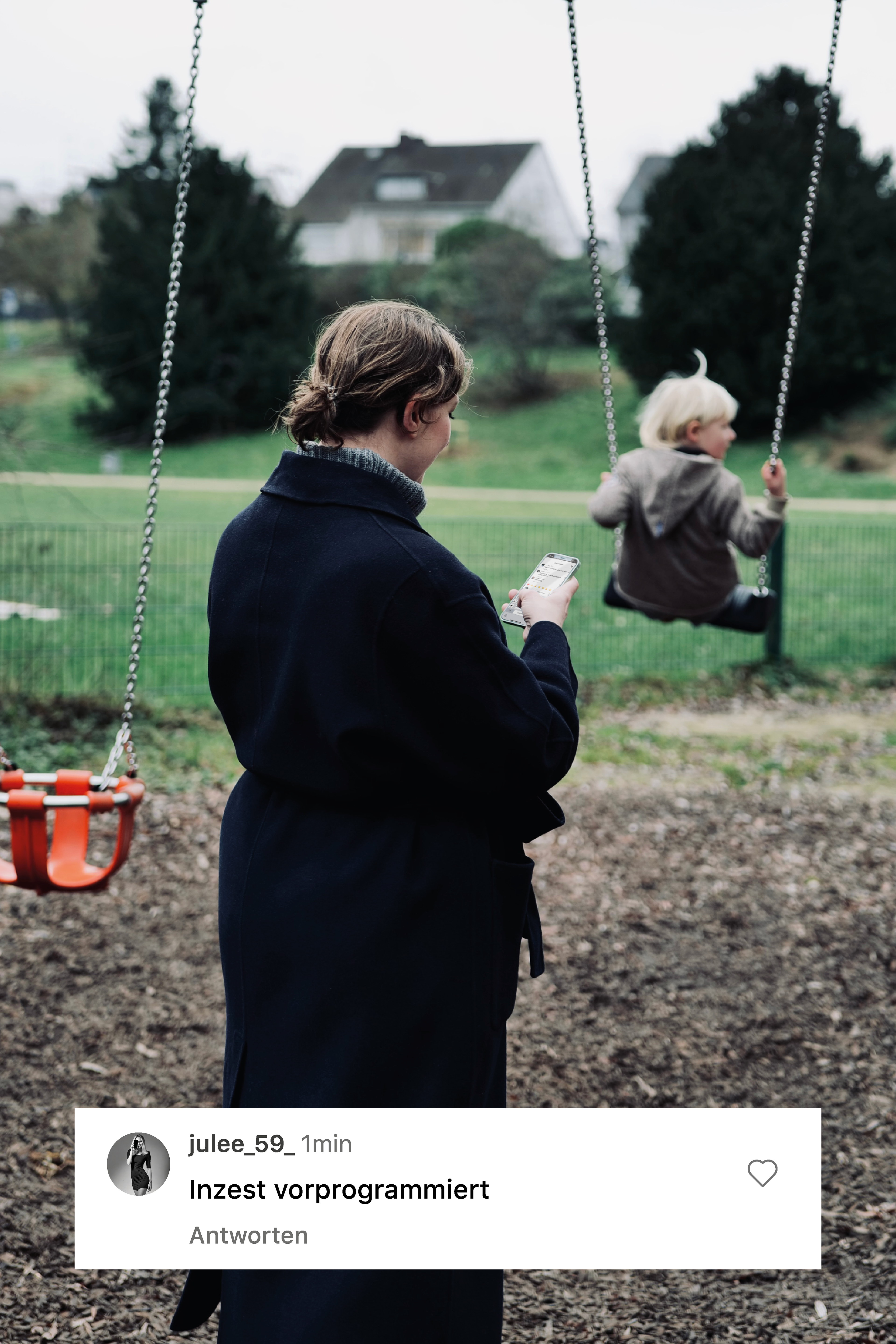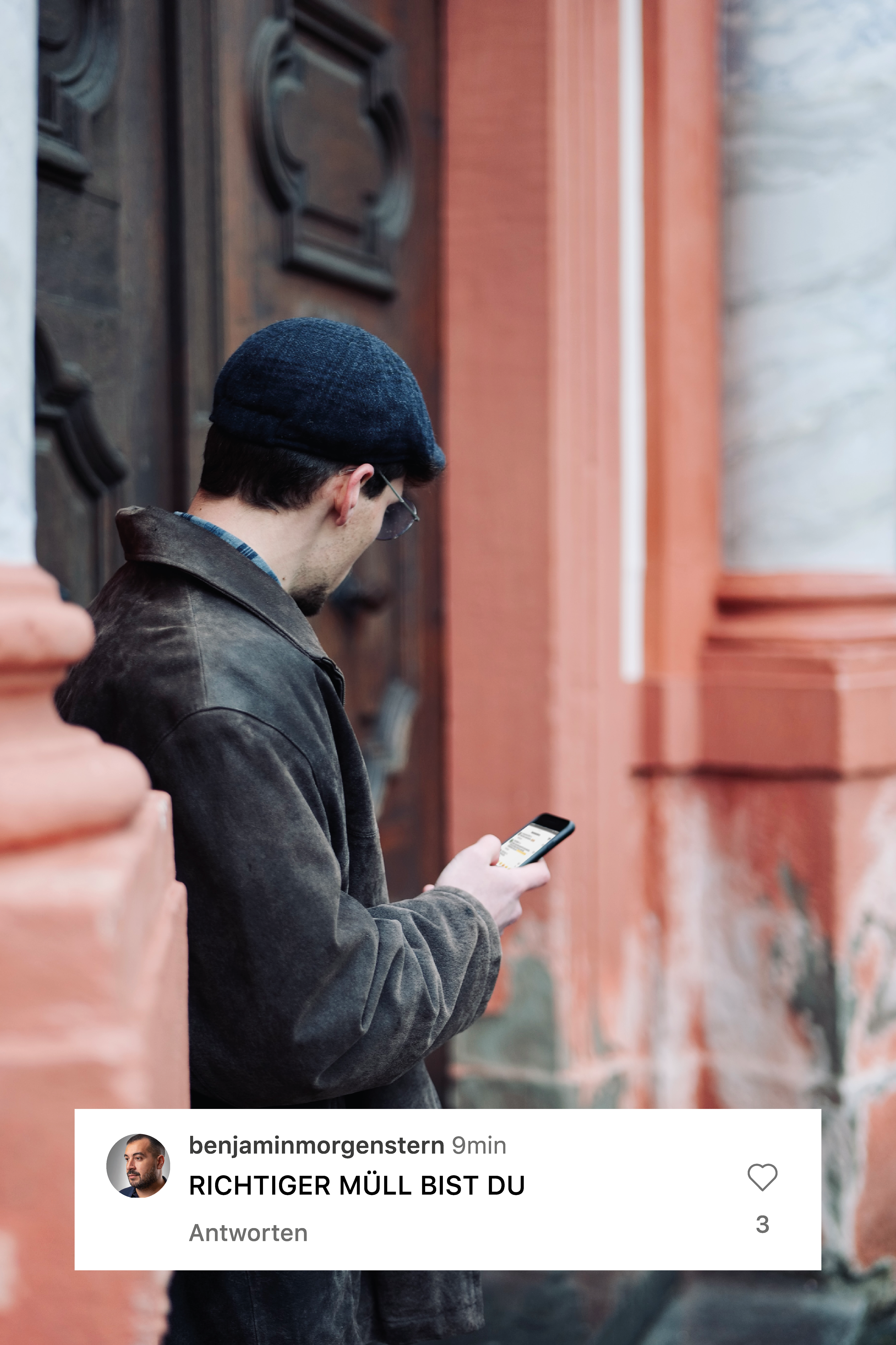 Mit meiner 21-teiligen Plakatserie „Is doch nur n‘ Kommentar“ möchte ich Hater:innen in alltäglichen Situationen zeigen, um beim Betrachter ein Störgefühl zu erzeugen.